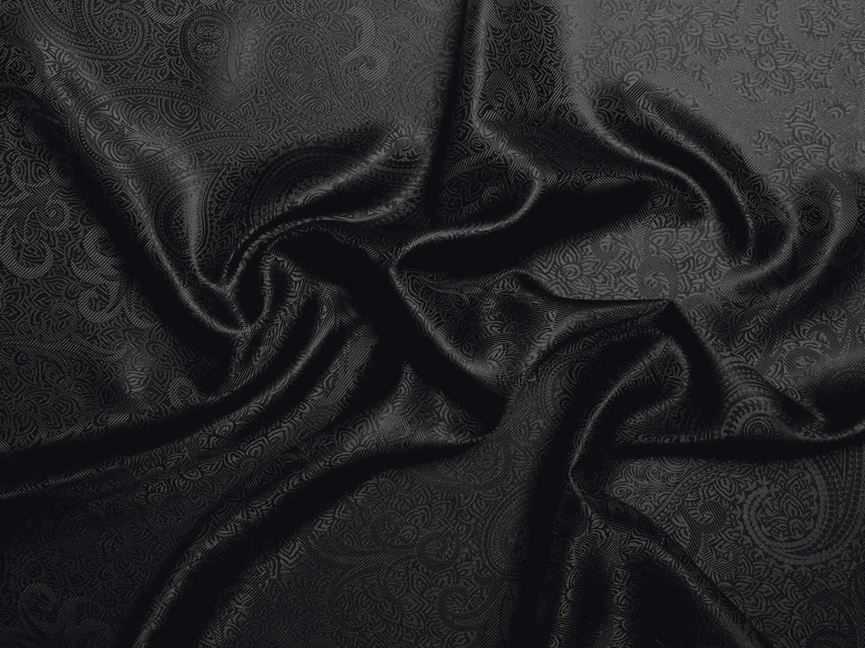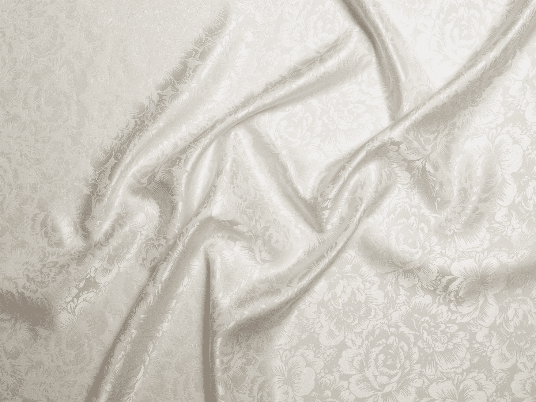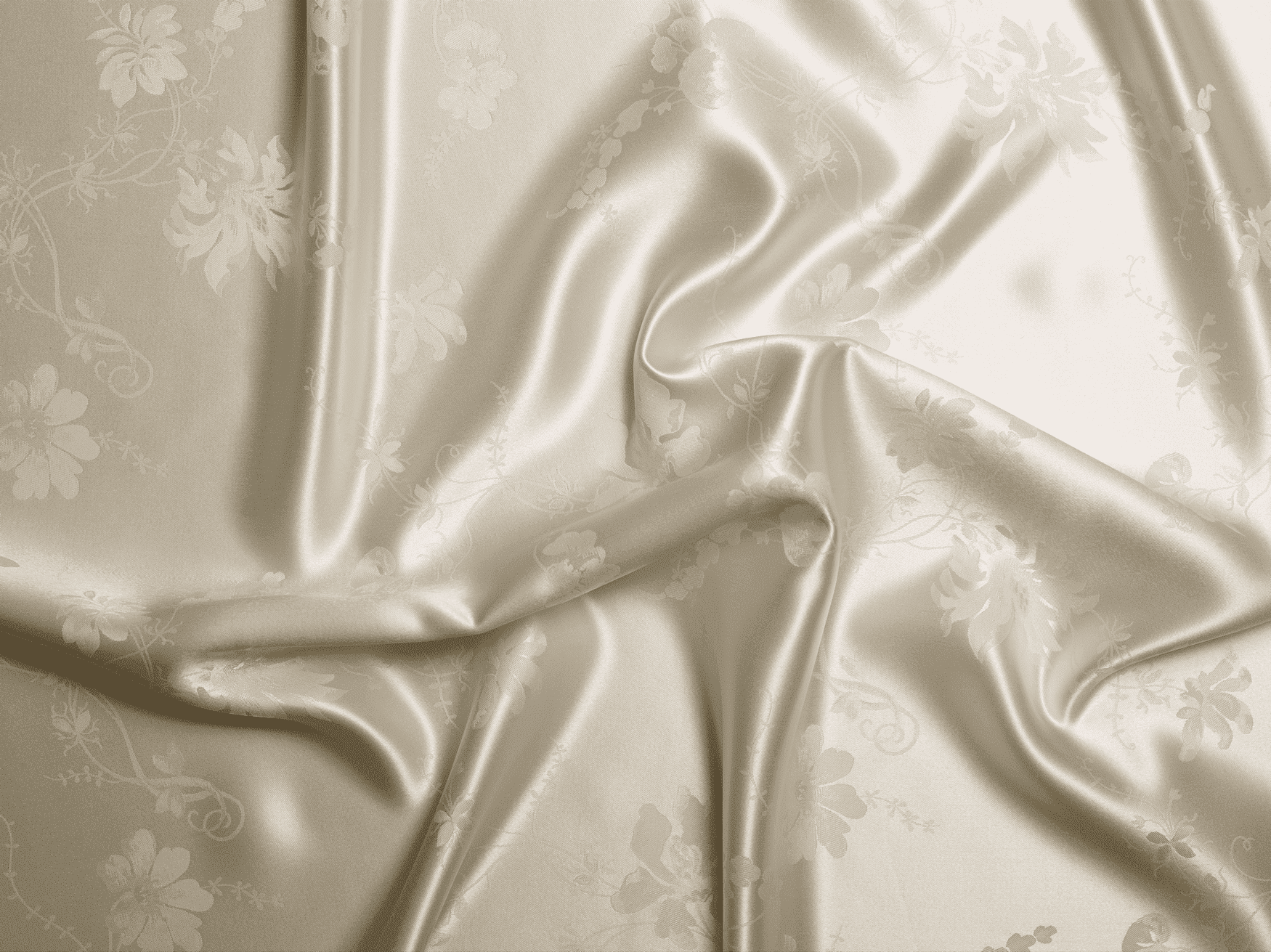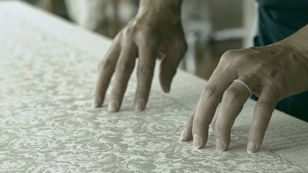 Les deux couches de tissu sont placées l'une sur l'autre à la main de manière à ce que le dessin jacquard corresponde. Les mesures sont reportées sur le tissu et le tissu de soie peut ensuite être découpé à la main à l'aide des repères et des lignes.
