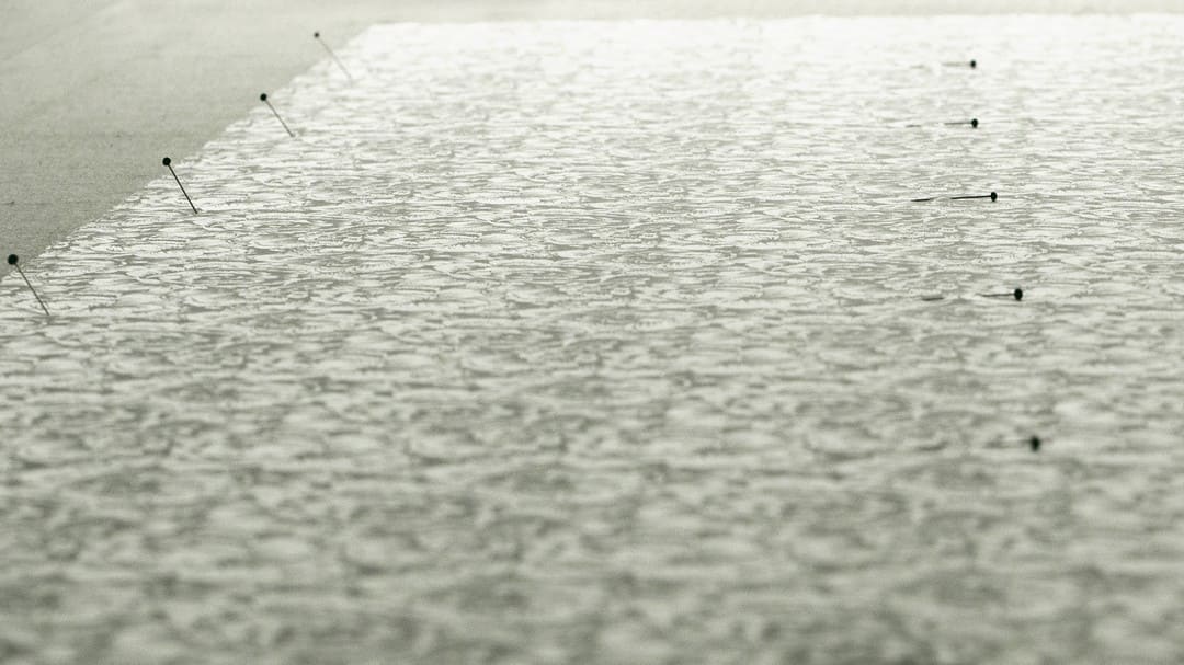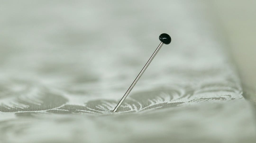 La répartition des carreaux est tracée en fonction du nombre prédéfini, le tissu de recouvrement est retourné sur l'envers, le dessin jacquard est à nouveau aligné avec précision, lissé à la main et finalement marqué avec des épingles.
