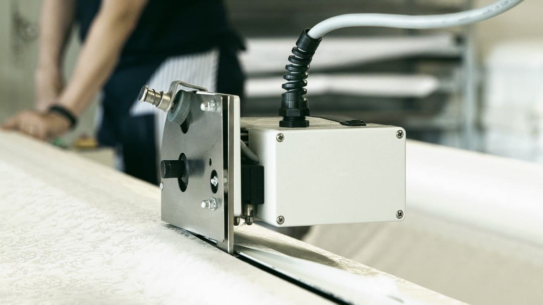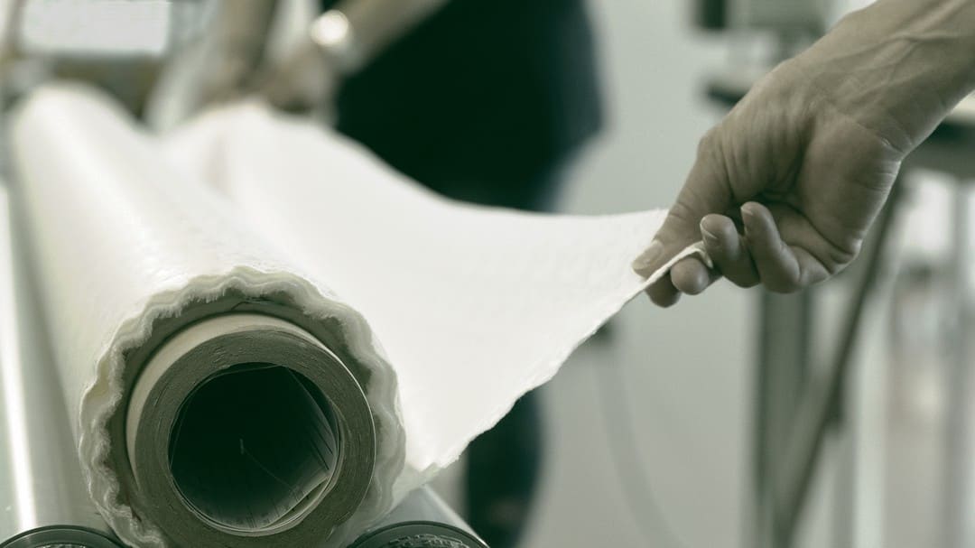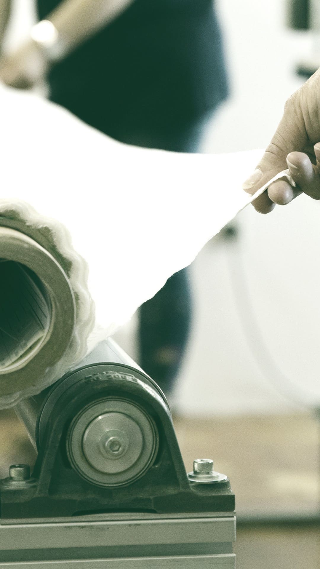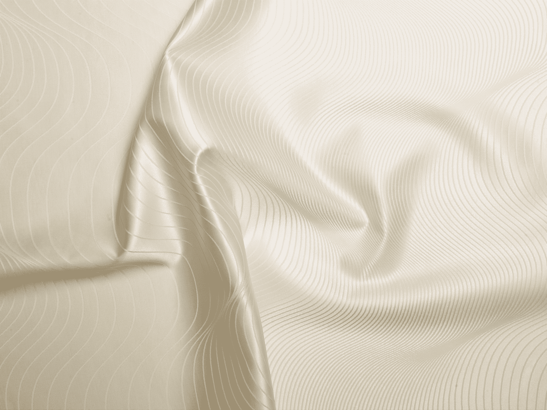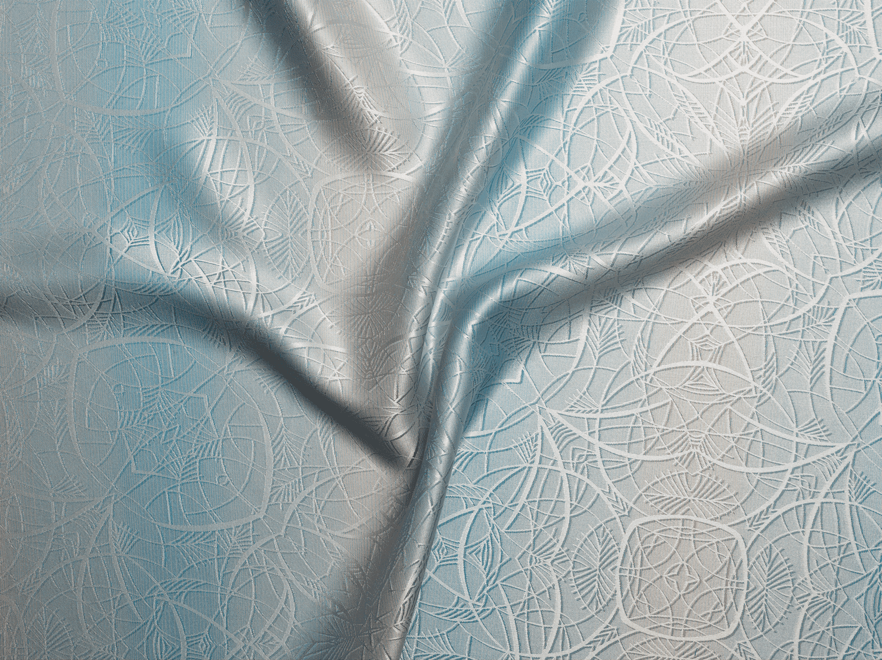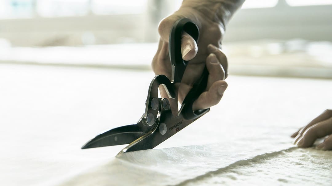 Le point de départ du revêtement est un jacquard de soie noble de la manufacture allemande. Celui-ci est tout d'abord déroulé de la balle, étalé sur la table de découpe et contrôlé quant aux défauts de tissage. Après ce premier contrôle de qualité minutieux, les lés de tissu sont préparés pour la découpe à la taille correspondante.