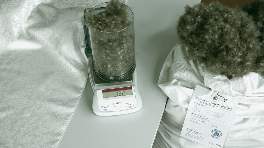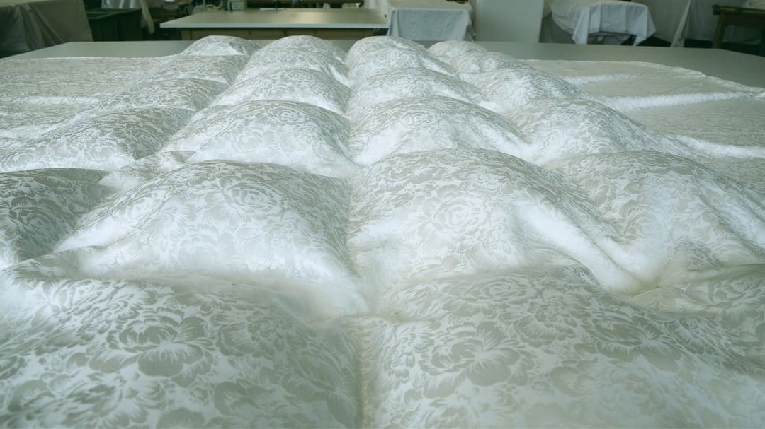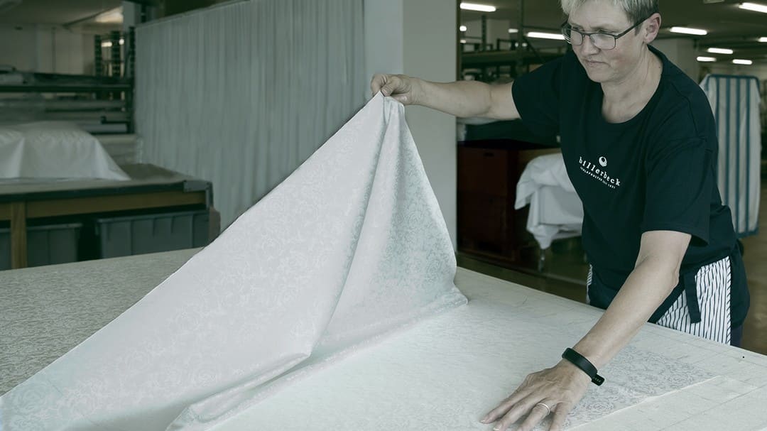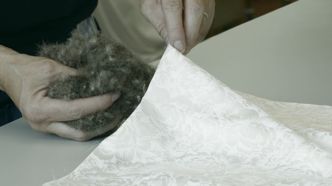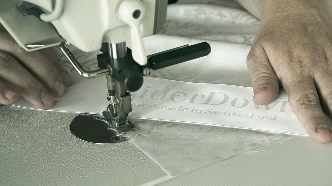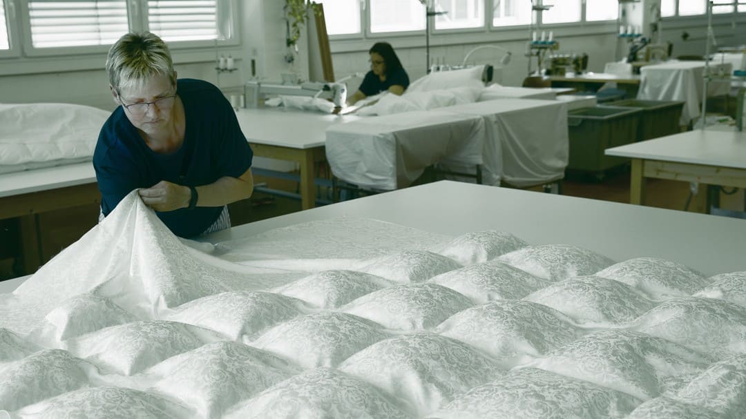 Seul le meilleur duvet d'eider d'Islande est utilisé et trié à la main avec amour pendant des heures avant d'être rempli manuellement dans chaque carreau. Le long de la couture transversale, chaque carreau est rempli au gramme près, la rangée est fermée et le côté long est finalement piqué. Le processus se répète jusqu'à ce que toutes les rangées soient remplies.