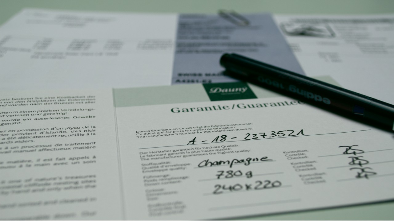 Après un contrôle final minutieux et complet, la fabrication est terminée et documentée de manière transparente par un certificat de qualité individuel. Nous garantissons ainsi, outre une qualité de fabrication maximale, un confort de sommeil exclusif et exceptionnel, et ce sous la forme d'une garantie étendue jusqu'à 5 ans.