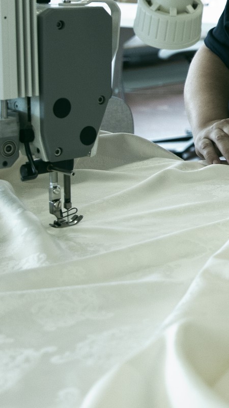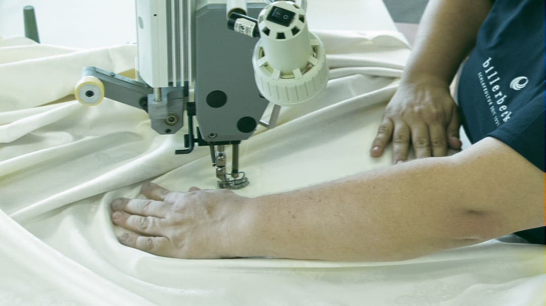 Dans cette étape, les côtés longs du duvet sont d'abord piqués et le label de qualité est cousu dans un coin. Ensuite, la première couture transversale est piquée au milieu du duvet.